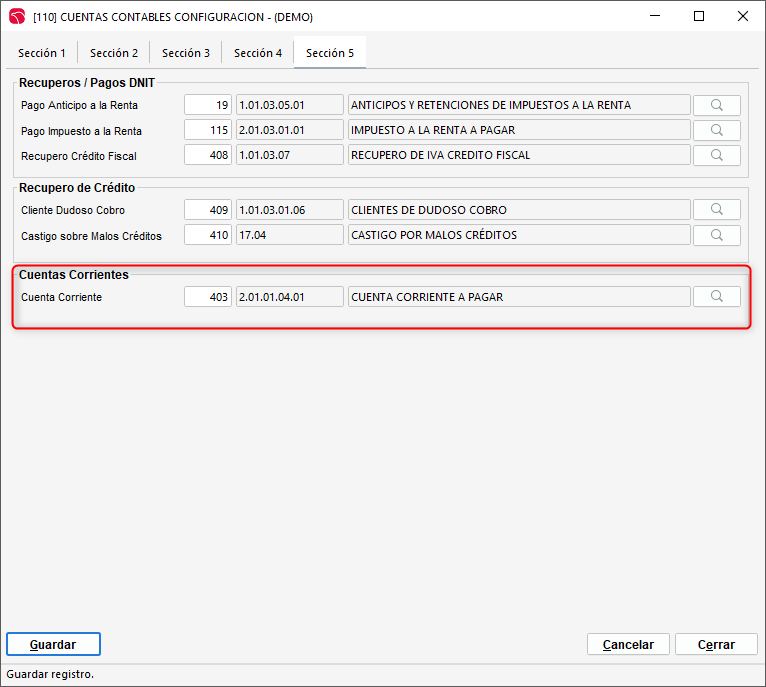 Dentro del formulario 110, en la casilla "Cuenta Corriente" de la sección 5, es necesario incluir la cuenta contable que el sistema utilizará para los asientos contables de los movimientos de cuentas corrientes.