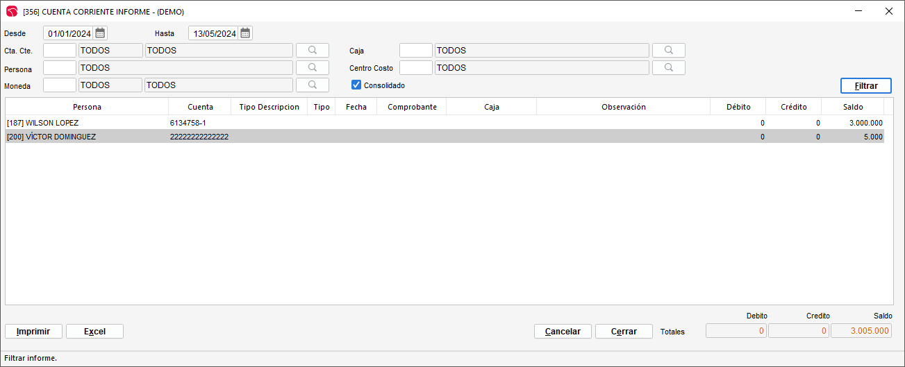 Este informe nos permite visualizar tanto de manera general como detallada los saldos de las cuentas corrientes de nuestros clientes.