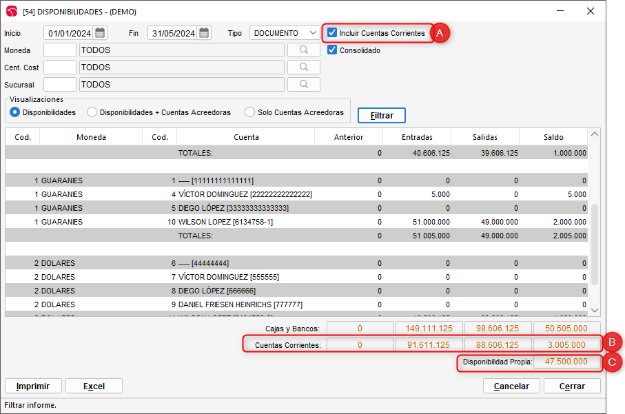 Este informe no solo nos permite visualizar los saldos de nuestras cajas, sino también los saldos en cuentas corrientes, proporcionándonos una visión clara de nuestra disponibilidad y cuánto corresponde a la misma.