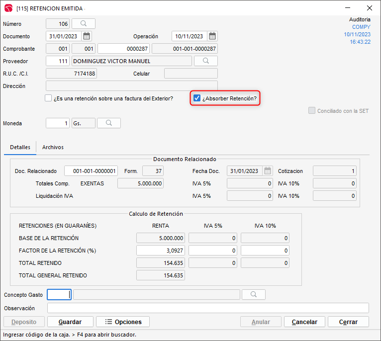 Ingresa los datos b谩sicos de la retenci贸n y marca el check "Absorber retenci贸n".露