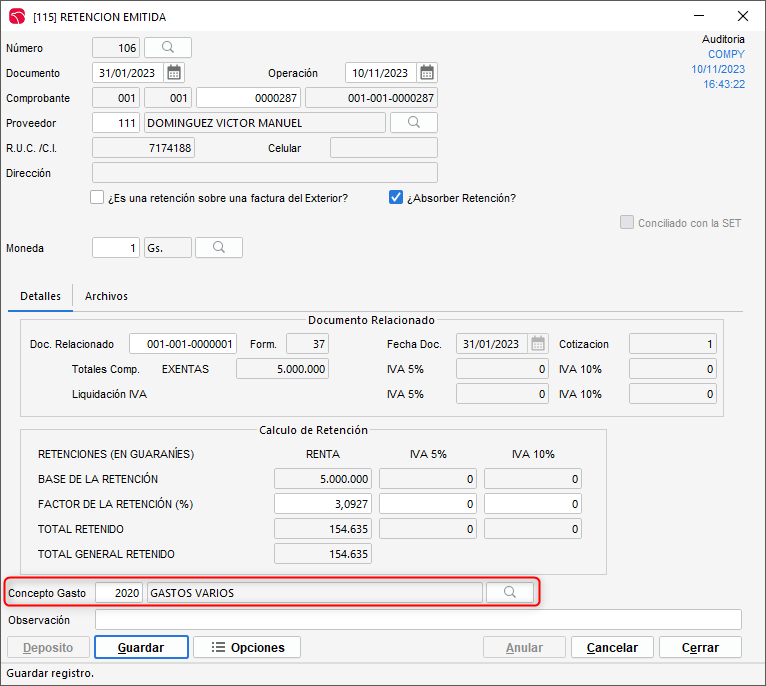 Vincula el concepto de gasto y guardar el registro.露